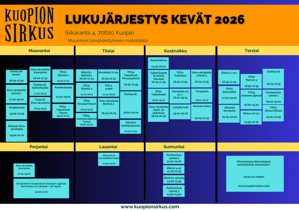 - Harjoituksissa on kannustava ja hyväksyvä ilmapiiri- kuka tahansa voi harrastaa sirkusta