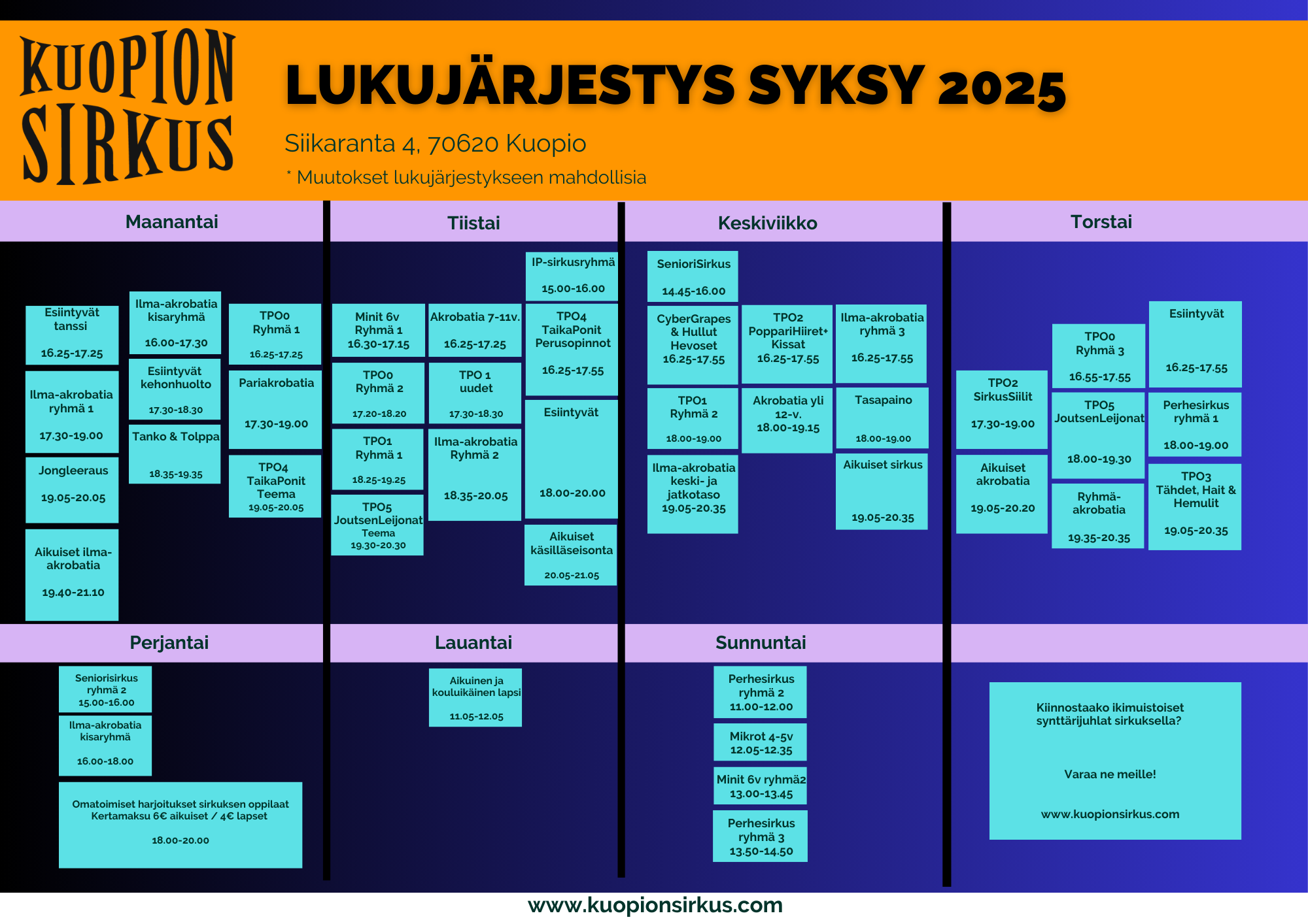Kuopion Sirkuksessa tuntien suunnittelusta ja opetuksesta vastaavat sirkusalan ammattilaiset yhdessä tuntiopettajien kanssa. Tunneilla tutustutaan eri sirkuslajeihin alkaen perusteista ja edeten ryhmän ja oppilaien taitojen karttuessa. Lisäksi tuntiohjelmaan kuuluvat lihashuolto sekä venytysharjoitukset. Harrastuksen aloittaminen Kuopion Sirkuksessa on helppoa. Kaikki opetuksessa käytettävät välineet löytyvät sirkukselta, joten mukaan ei tarvitse kuin sisäliikuntaan soveltuvat vaatteet ja avointa mieltä. Laji sopii kaiken ikäisille ja -kokoisille ja tarjoaa haastetta niin vasta-alkajille kuin kokeneemmille harrastajillekin.
