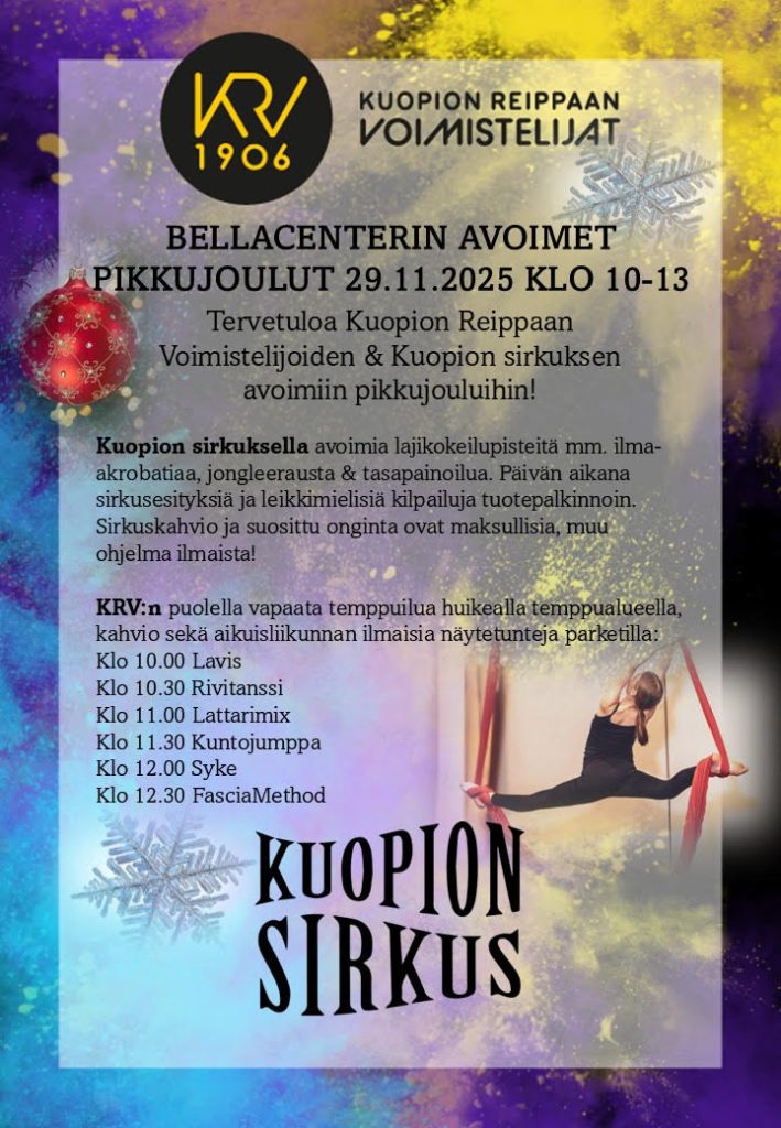 Kenelle: Kaiken tasoisille jongleerauksesta kiinnostuneille Mitä mukaan: Joustavat liikunnalliset vaatteet ja vesipullo Milloin: 25.11. ja 2.12.2025 Ti klo 17.30-18.30 Missä: Kuopion Sirkus Siikaranta 4, Kuopio Hinta: 40€ Kurssi toteutuu mikäli minimiosallistujamäärä täyttyy.